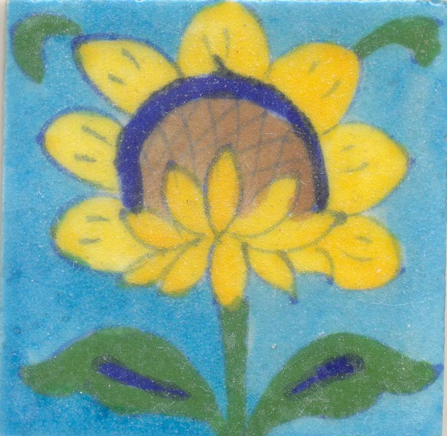 Yellow,Blue and Brown Flower and Green and Blue leaf with Turquoise Base Tile